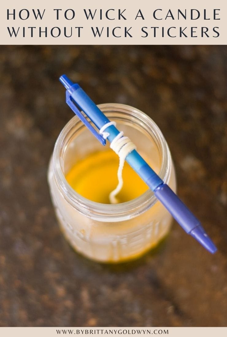 - Take your candle wick and attach it to the wick holder with glue. Then glue them down the glass jar in the center. After that, take the chopstick or wooden stick you have prepared to tight a knot with the remaining part of the candlewick.